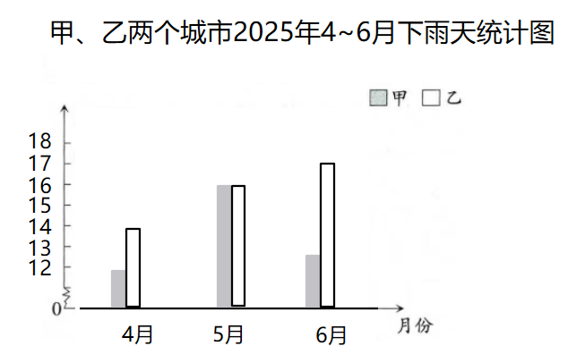二、下面是甲、乙两个城市2025年4~6月下雨天数统计表,请根据统计表制作出复式条形统计图。