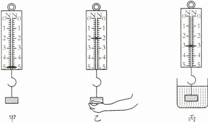 N.(3)当物体浸入水后,如丙实验所示,将丙实验与甲、乙实验对照.说明水对物体也有向上的托力,即浮力.水对物体的浮力$F_{浮}= $