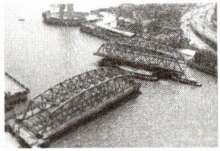 7. 具有百年历史的上海外白渡桥南段在潮水上涨时,借助驳船受到的浮力将桥慢慢顶起,并在原地转向,由驳船经黄浦江运载到工厂进行维修(如图所示).若外白渡桥南段装载到驳船后,驳船的排开水的体积增加了$560m^{3}$,则外白渡桥南段重为__