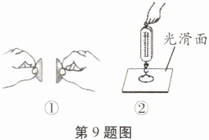 9. 小明取两个挂东西的小吸盘,按图①对接,挤出吸盘内部的空气,然后拉开吸盘. 拉开吸盘需要用较大的力,这说明了