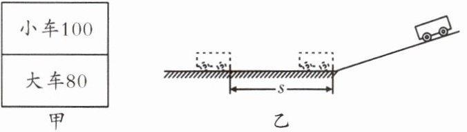 8. 小春发现高速公路常有如图甲所示的限速警告标志,他问爸爸:为什么在相同的道路上行驶的汽车却会有不同的最高时速限制呢?爸爸告诉他:大车质量大,惯性大,如果速度太快的话,遇紧急情况时不能及时停下来,极易造成交通事故。小春想:这就是说在相同情况下大车要停下来所用的距离比小车要长?为此,他设计了如图乙所示的装置及以下探究方案: