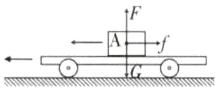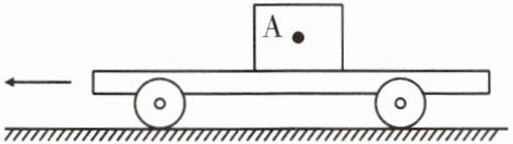 7. 如图所示,木块A与平板小车一起在水平桌面上向左匀速运动,当小车受外力作用突然减速时,木块随即在小车的平板上滑行。请在图中用带箭头的线段标出木块滑行的方向,并画出木块滑行过程中的受力示意图。