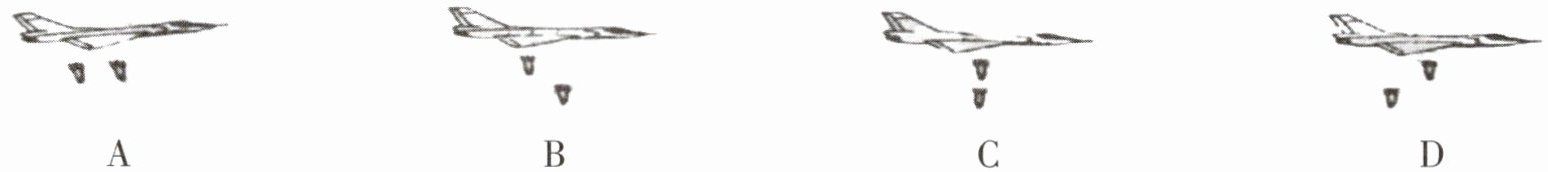 1. 如图所示,从水平匀速直线飞行(从左向右飞)的飞机上先后落下两颗炸弹,在不计空气阻力的条件下,能正确反映飞机和两颗炸弹运动情况的是(