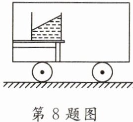 8. 平直轨道上运动的列车内桌面上水杯水面如图所示,则列车正在向$\underline{