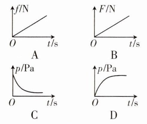 2. (2024·湖北模拟)如图所示,某工厂用传送带传送工件,将工件(其重心为O)由图示位置从静止放到水平向右匀速运动的传送带上,则传送带受到的压力F、压强p及工件受到的摩擦力f随时间变化的图象正确的是(