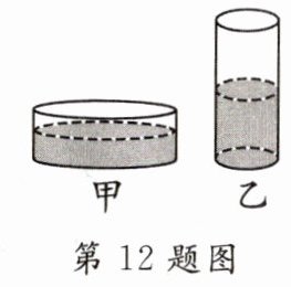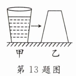13.(2024·黑龙江模拟)将一未装满饮料的密闭饮料杯,先正立放置在水平桌面上,如图甲所示,饮料杯对水平桌面的压强是$ p_{1} $,饮料对杯底的压力是$ F_{1} $,再将饮料杯倒立放置,如图乙所示(图中没有画出饮料液面的位置),饮料杯对水平桌面的压强是$ p_{2} $,饮料对杯底的压力是$ F_{2} $,则$ p_{1} $