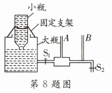 D.若关闭止水阀$ S_{2} $,打开止水阀$ S_{1} $,待水面稳定后,A、B两管的水面与大瓶中水面一样高