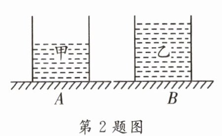 2.(2024·湖北模拟)如图所示,完全相同的两个圆柱形容器A和B分别盛有质量相等的甲、乙两种液体,B容器的液面高于A容器液面。将两个完全相同的小球分别放入甲、乙液体中,静止后受的浮力分别是$F_1、$$F_2,$下列判断正确的是(