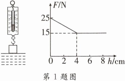 1.(2024·四川模拟)将一实心圆柱体悬挂于弹簧测力计下,物体下表面刚好与水面接触,从此处匀速下放物体,直至浸没(物体未与容器底接触)的过程中,弹簧测力计示数F与物体下表面浸入水中深度h的关系如图所示,则下列说法正确的是((