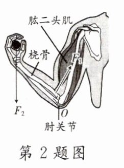2. (2023·淄博)肱二头肌收缩产生的力使前臂骨骼绕肘关节转动, 此时前臂骨骼可以看成一个杠杆模型, 简称前臂杠杆. 如图所示, 手提重物时, 对前臂杠杆的分析错误的是 (