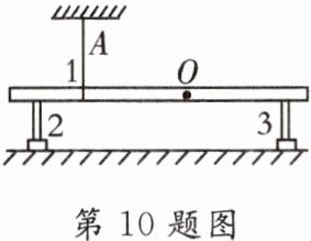 10. (2023·淮安)如图所示, 一根质地不均匀的硬棒重心在$O$点, 将硬棒通过绳1悬挂于$A$点, 2、3为两个支架, 在绳与两支架的作用下, 硬棒水平静止, 此时绳与支架均对硬棒有弹力(绳的形变忽略不计). 下列操作中, 仍能使硬棒保持平衡的是 (