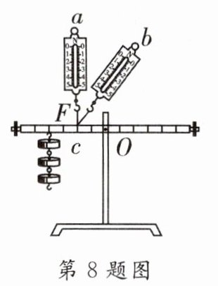 8.A [解析]将弹簧测力计绕c点从a位置转动到b位置的过程中,钩码的重力不变,其力臂不变,即阻力与阻力臂的乘积不变;将弹簧测力计绕c点从a位置转动到b位置的过程中,拉力F的力臂逐渐变小,由杠杆的平衡条件$F_{1}L_{1}=F_{2}L_{2}$可知,拉力F逐渐变大.