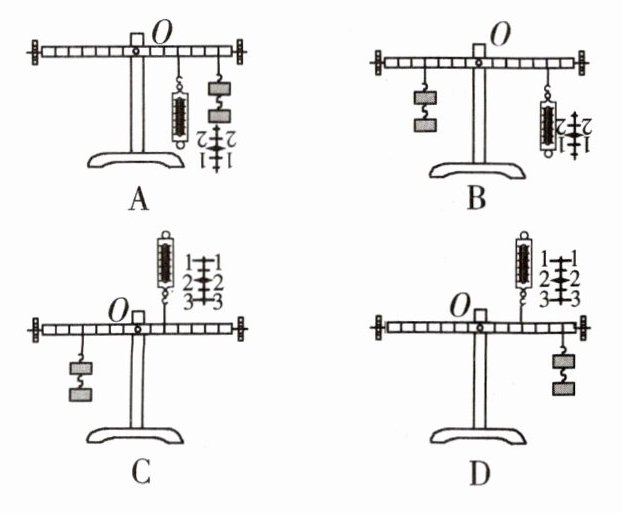 6. (2024·黑龙江模拟)质地均匀的杠杆, 每个钩码重0.5 N, 下列操作中可以使杠杆在水平位置平衡的是(杠杆上有等间隔的刻度) (