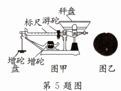 5. (2023·济南)如图甲所示的案秤是生活中测量质量的常用工具, 与各1个标有“0.5 kg”“1 kg”“5 kg”和2个标有“2 kg”的增砣配套使用. 如果把图乙所示的标有“2 kg”的增砣放在秤盘中称量它的质量, 测量结果应该 (