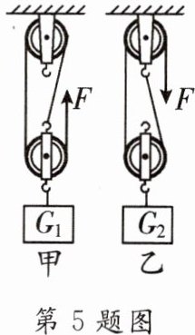 5. (2024·新疆模拟)如图所示,每个滑轮的重力相等,不计绳重和摩擦力,$ G_1 = 60N $,$ G_2 = 38N $,甲、乙两种情况下绳子在相等拉力$ F $作用下静止.则每个动滑轮的重力为((