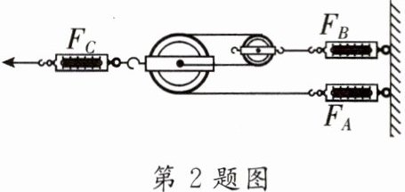 2. (2024·湖南模拟)如图所示,不计滑轮自重及绳子与滑轮之间的摩擦,三个弹簧测力计拉力$ F_A $、$ F_B $、$ F_C $的关系正确的是( )