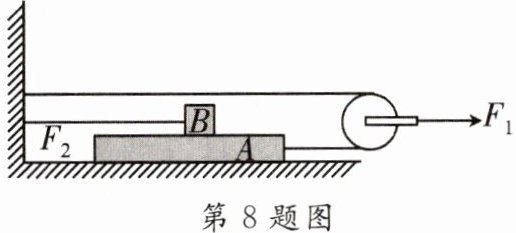 8. (2024·四川模拟)用水平力$ F_1 $拉动如图所示装置,使木板$ A $在粗糙水平面上向右匀速运动,物块$ B 在木板 A $上表面相对地面静止,连接$ B 与竖直墙壁的水平绳的拉力大小为 F_2 $.不计滑轮重和绳重,滑轮轴光滑.则$ F_1 与 F_2 $的大小关系是(