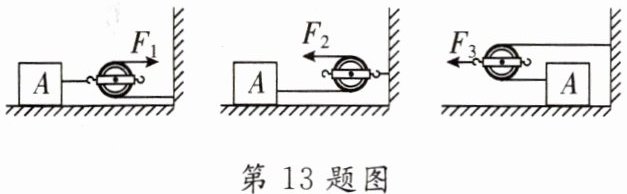 13. 如图所示,三个滑轮拉同一物体在水平面上做匀速直线运动,所使用的拉力分别为$ F_1 $、$ F_2 和 F_3 $,不计滑轮重力、轮与绳之间的摩擦,则(