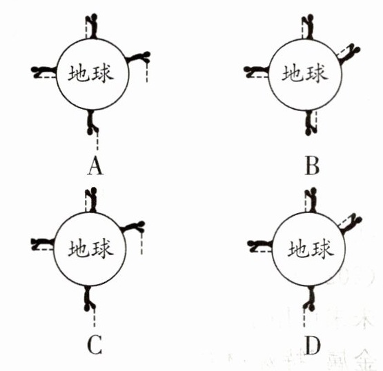 12. 如图所示是描述地球上不同位置的人释放手中石块的四个示意图,图中的虚线表示石块下落的路径,则对石块下落路径的描述最接近实际的示意图是(