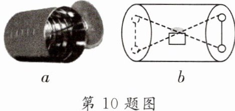 10. (2024·湖北模拟)如图所示,在一个金属罐的盖和底各开两个小洞。将小铁块用细绳绑在橡皮筋的中部穿入罐中,橡皮筋两端穿过盖和底的小洞并固定起来,使小铁块悬于罐体内。做好后将罐子从不太陡的斜面滚下,罐子和小铁块的动能会转化为橡皮筋的