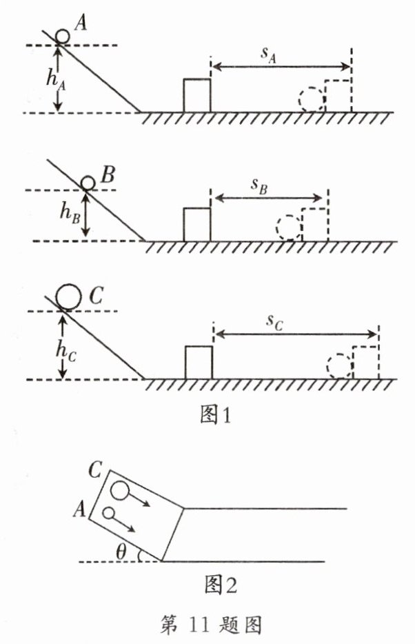 11.(2024·湖南模拟)如图1所示是探究“物体的动能大小与哪些因素有关”的实验装置图,其中,$m_{A}= m_{B}\lt m_{C},h_{A}= h_{C}>h_{B}$.