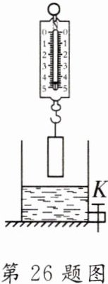 26.(2024·重庆模拟)底面积为$150 cm^2、$重3 N、盛水4 cm深且足够高的薄壁柱形容器置于水平桌面上,如图所示,将底面积为$50 cm^2、$质量为450 g、密度为$0.9 g/cm^3$的不吸水圆柱体用轻质细线挂在测力计下,由图示位置缓慢向下浸入水中,直至测力计示数为0后,只取走测力计,再打开阀门K向外放水.求:(g取10 N/kg,水的密度ρ_水$ = 1.0×10^3 kg/m^3)$