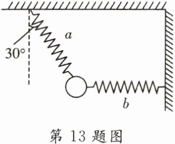 13. (2024·黄冈二模)如图所示,两轻弹簧a、b悬挂一小铁球处于平衡状态,a弹簧与竖直方向成$30^{\circ}$角,a、b的劲度系数分别为$k_{1}$、$k_{2}$.则两弹簧的伸长量$x_{1}与x_{2}$之比为(