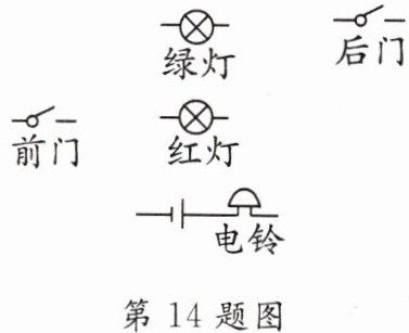 14. (2024·山东模拟)学习了电路相关知识后,小明想给自家的养殖场设计一种呼叫装置,要求前后门来的客人均可呼叫,前门来的客人关闭开关,办公室的电铃响、红灯亮;后门来的客人关闭开关,办公室的电铃响、绿灯亮.请在图中帮助他画出符合要求的电路图.(导线不得交叉)