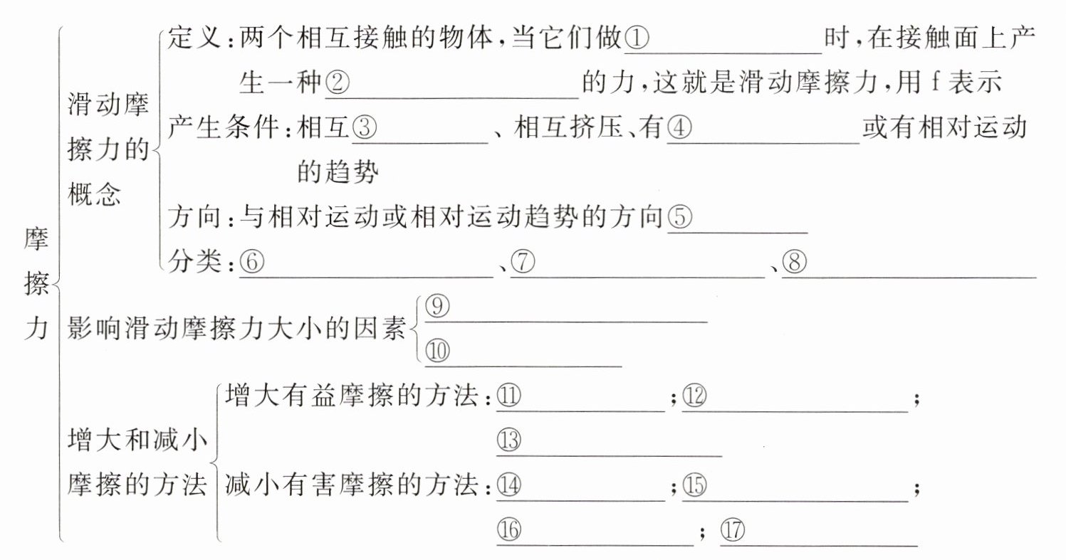 ①相对滑动 ②阻碍相对运动 ③接触 ④相对运动 ⑤相反 ⑥静摩擦力 ⑦滑动摩擦力 ⑧滚动摩擦力 ⑨接触面的粗糙程度 ⑩压力 ⑪增大压力 ⑫增大接触面粗糙程度 ⑬变滚动摩擦为滑动摩擦 ⑭减小压力 ⑮减小接触面的粗糙程度 ⑯变滑动摩擦为滚动摩擦 ⑰使接触面分开