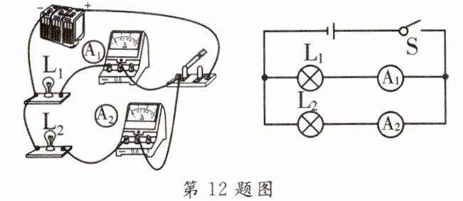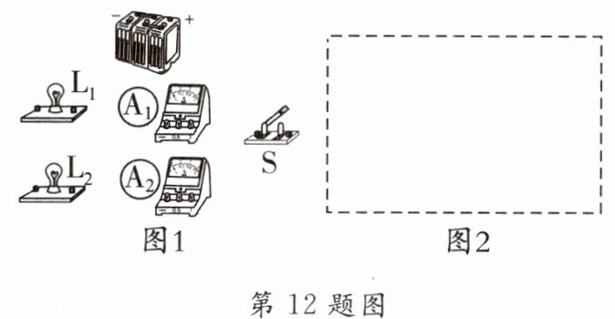 (1)在如图1所示的实物图中,用笔画线代替导线连接好电路.要求:$ A_1 测 L_1 $的电流,$ A_2 测 L_2 $的电流,开关控制$ L_1 $、$ L_2 $.($ L_1 $、$ L_2 $电流不超过0.6 A;连线不能交叉)