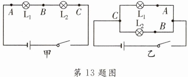 13. 在图中,当开关闭合时,测得通过A点和B点的电流都是0.4 A.则图甲中通过C点的电流是____