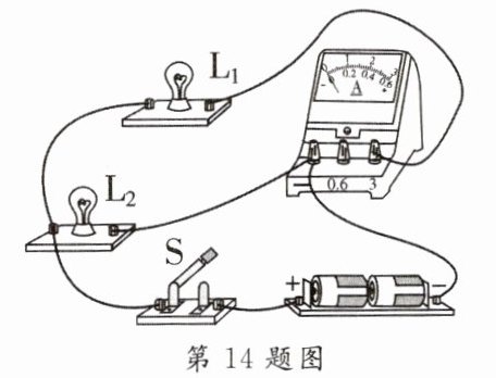 (4)小明先将电流表接在$ L_1 $所在的支路上,闭合开关,观察到灯$ L_2 $发光,但灯$ L_1 $不亮,电流表的示数为零,电路可能存在的故障是____(填“灯$ L_1 $断路”或“灯$ L_1 $短路”).