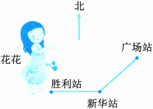花花从胜利站出发,向______走 到新华站,再向______方向走到广场站。