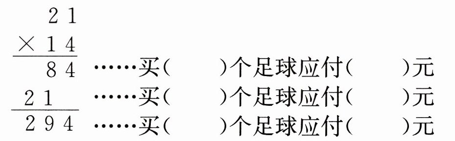 1. 李老师买回 14 个足球,每个 21 元。根据下面的竖式,在( )里填合适的数。