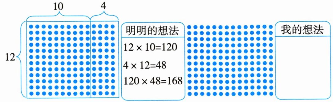 本题可根据两位数乘两位数的算理,通过圈一圈、标一标以及写一写的方式来展示计算$14×12$的过程。