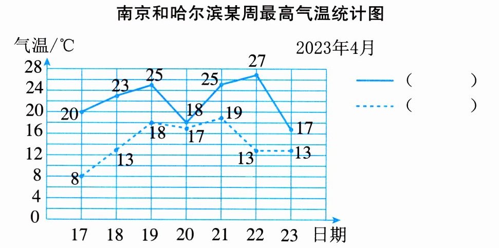 四、下表是南京和哈尔滨两座城市在2023年4月某一周每天的最高气温数据。