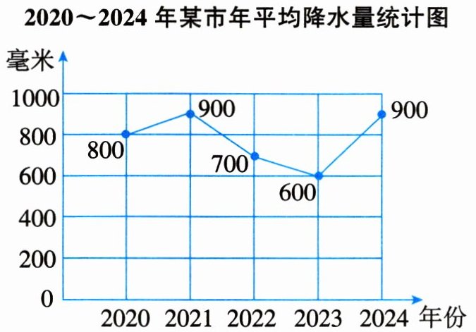 1. 2020年的年平均降水量是( )毫米,2023年的年平均降水量是( )毫米。