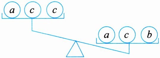 8. 如图所示,有三种不同的小球,质量分别为a,b,c,放置在天平的托盘中,结果天平右侧向下倾斜,则可得到(