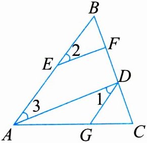 因为AB//GD,所以∠1=∠3,因为AD//EF,所以∠2=∠3,所以∠1=∠2.