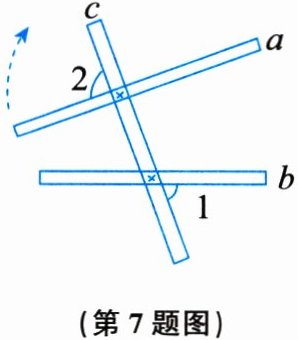 7. 如图所示,将木条 $ a $,$ b $ 与木条 $ c $ 钉在一起,$ ∠1= 70^{\circ} $,转动木条 $ a $,当 $ ∠2= $
