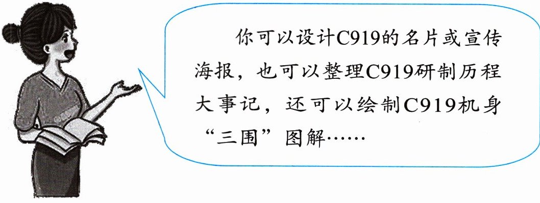 【解析】:本题主要考查了学生对C919相关信息的搜集、整理及呈现能力,涉及到语文综合实践方面的知识,包括信息收集、文字组织、设计制作等内容。学生需要选择一个感兴趣的问题,如C919名字含义、发展历程、硬核高科技等,通过上网搜索获取相关信息,然后以合适的方式呈现学习成果,比如设计名片、宣传海报,整理大事记,绘制“三围”图解等。