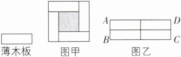 6 [较难]将尺寸如图所示的 4 块完全相同的长方形薄木板(厚度忽略不计)进行拼摆,恰好可以不重叠地摆放在如图的甲、乙两个方框内。已知薄木板的宽为 2,图甲中阴影部分的面积为 19,则图乙中$AD$的长为______。