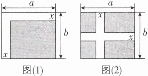 (1)中,阴影部分面积为(a−x)(b−x),题图