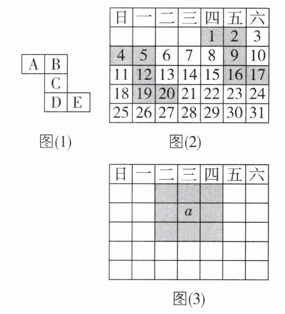 (3)如图(3),在某月历中,用正方形方框框住9个数(阴影部分),如果最小的数和最大的数的乘积为57,那么中间位置上的数$a = $____.