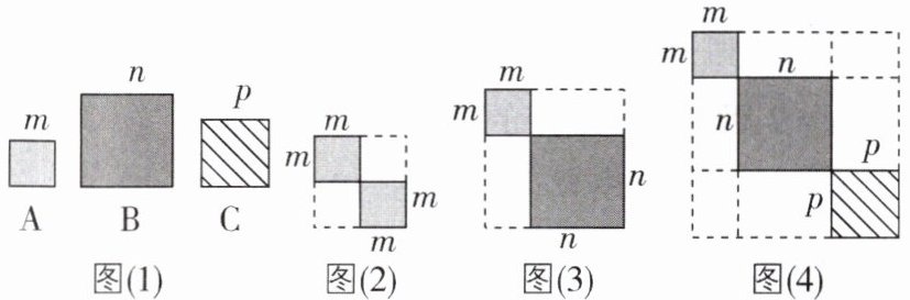7 <新考法>[2025 浙江杭州期中,较难]如图(1),正方形 A、B、C 的边长分别为$m$,$n$,$p$。