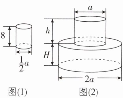(2)中瓶子的体积为$π(\frac {a}{2})^{2}h+πa^{2}H=\frac {1}{4}πa^{2}h+πa^{2}H=(\frac {1}{4}h+H)πa^{2}$.题图