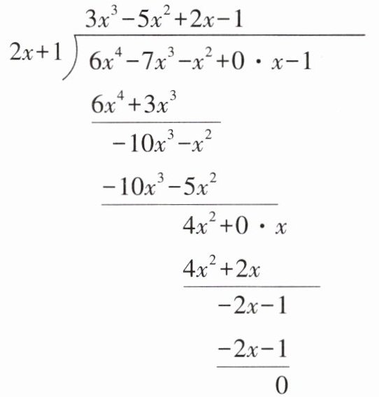 $\begin{array}{r}3x^{3}-5x^{2}+2x-1 \\\hline2x+1\enclose{longdiv}{6x^{4}-7x^{3}-x^{2}+0\cdot x-1} \\6x^{4}+3x^{3} \\\hline-10x^{3}-x^{2} \\-10x^{3}-5x^{2} \\\hline4x^{2}+0\cdot x \\4x^{2}+2x \\\hline-2x-1 \\-2x-1 \\\hline0\end{array} $