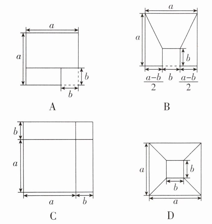 4 [2024 山西大同模拟,中]数形结合是数学解题中常用的思想方法,数形结合的思想可以使某些抽象的数学问题直观化、生动化,有助于把握数学问题的本质.在学习整式运算乘法公式的过程中,对于每个公式的推导,教材编写者都运用了图形面积来加以验证.下列图形中,不能借助图形面积验证$(a+b)(a-b)= a^{2}-b^{2}$的正确性的是 ( )