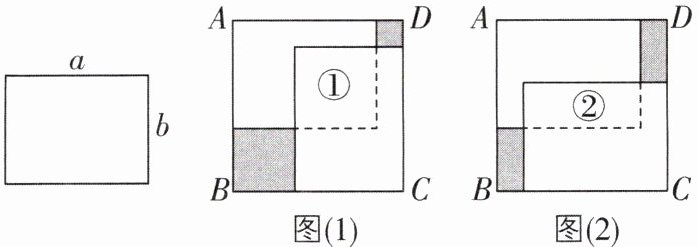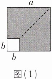 (1)中阴影部分的面积为两个正方形的面积差,即$a^{2}-b^{2}$,题图