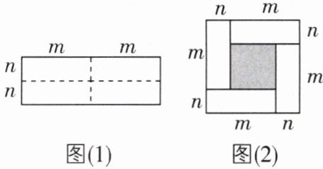 18[2025吉林长春德惠期中]图(1)是一个长为$2m$,宽为$2n$的长方形,沿图中虚线用剪刀将其剪成四个相同的小长方形,然后按图(2)所示方式拼成一个正方形.